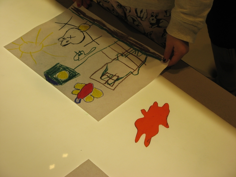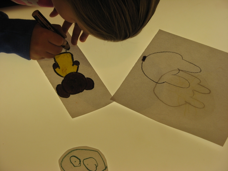 Af en toe worden de tekeningen ook rechtop gebruikt als poppen en wordt er mee gespeeld op een tekening en/of op de lichttafel.
